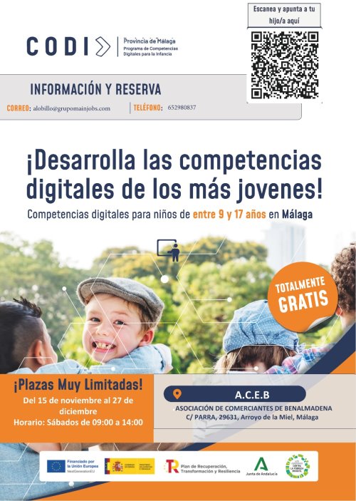 La sede de la Asociación de Comerciantes y Empresarios de Benalmádena (ACEB), acogerá un curso gratuito de Competencias Digitales (CODI) dirigido a niños, niñas y adolescentes del municipio, de 9 a 17 años de edad. La asociación ha cedido sus instalaciones para el desarrollo de esta actividad formativa, que tendrá lugar todos los sábados, del 15 de noviembre al 27 de diciembre, de 9:00 a 14:00 horas.