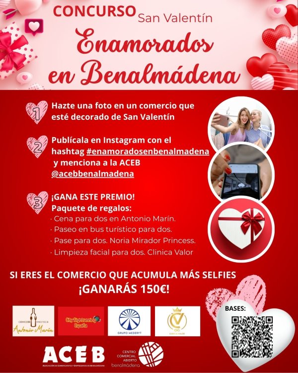 La Asociación de Comerciantes y Empresarios de Benalmádena (ACEB) y la asociación Centro Comercial Abierto de Benalmádena (ACCAB) han puesto en marcha la campaña de San Valentín, con el concurso selfie ‘Enamorados en Benalmádena’. La persona ganadora del certamen se llevará un paquete de experiencias valorado en 225 euros, y el local en el que se realicen más selfies ganará un premio en metálico de 150 euros.