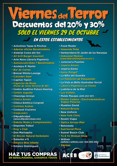 Casi 60 establecimientos comerciales de Benalmádena, de diferentes sectores, ofrecerán descuentos de entre el 20 y el 30 por ciento durante la sexta edición del ‘Viernes del Terror’ que se desarrollará mañana, día 29 de octubre. Se trata de una jornada de descuentos que se incluye dentro de las actividades de dinamización del comercio en otoño que organiza la Asociación de Comerciantes y Empresarios de Benalmádena (ACEB) con la colaboración de la Asociación Centro Comercial Abierto de Benalmádena (ACCAB) y el apoyo económico del Ayuntamiento de Benalmádena.