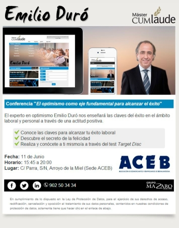 Con el título "El optimismo como eje fundamental para alcanzar el éxito", la charla se desarrollará de 15:45 a 20:00 horas. Las empresas que hayan contratado previamente alguno de los cursos bonificados con la Seguridad Social de Master CumLaude, podrán tener acceso directo y gratuito a esta conferencia de Emilio Duró. No obstante, existen otras posibilidades de acceder a esta charla. Para mayor información, pueden ponerse en contacto con Antoine Miranda, en el teléfono 902 50 34 34.