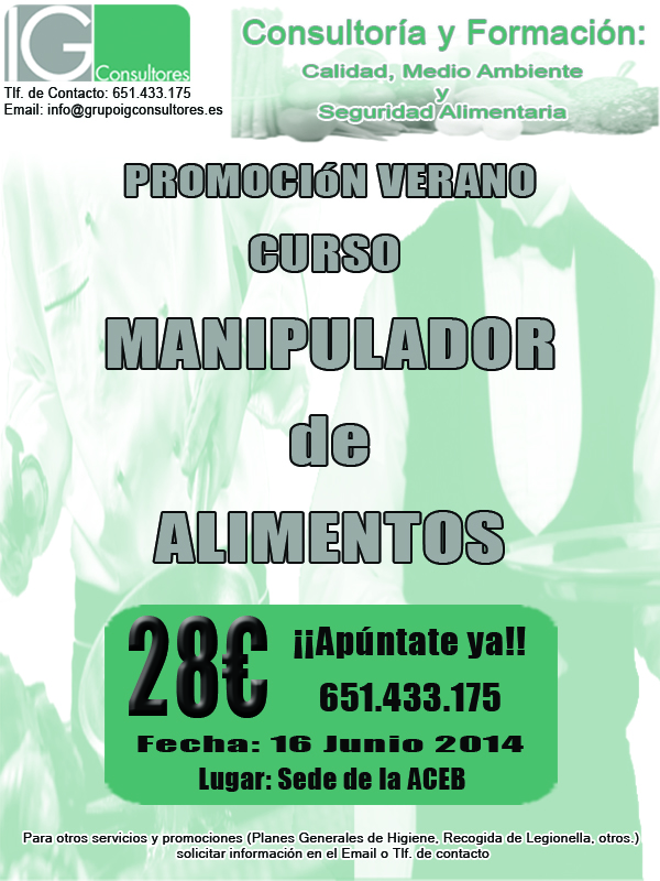 IG Consultores, impartirá en la sede de la ACEB un curso para la obtención del carné de manipulador de alimentos. El curso se desarrollará el 16 de junio, de 16:00 a 19:00 horas, y su precio es de 28 euros.