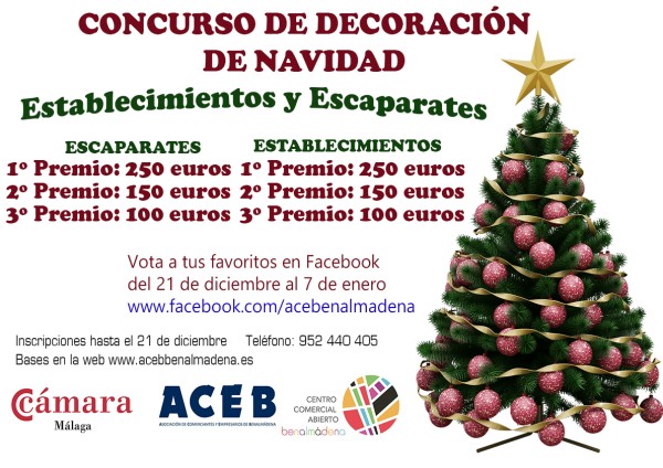 La Asociación de Comerciantes y Empresarios de Benalmádena convoca la cuarta edición del Concurso de Decoración de Navidad que se organiza con la colaboración de la Cámara de Comercio de Málaga y que repartirá 1.000 euros. Los premios serán seis: tres en la categoría de Escaparates, de 250, 150 y 100 euros para el primer, segundo y tercer puesto, respectivamente, y otros tres en la categoría de Establecimientos, también de 250, 150 y 100 euros para el primer, segundo y tercero clasificado, respectivamente.