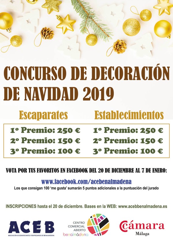 La Asociación de Comerciantes y Empresarios de Benalmádena (ACEB) convoca el tradicional Concurso de Decoración de Navidad para establecimientos comerciales y empresas, con la colaboración de la Cámara de Comercio de Málaga. El certamen repartirá 1.000 euros en premios distribuidos en dos categorías. Para los escaparates, los premios serán de 250, 150 y 100 euros para el primer, segundo y tercer puesto, respectivamente, y otros tres para la categoría de establecimientos, también de 250, 150 y 100 euros para el primer, segundo y tercero clasificado, respectivamente.