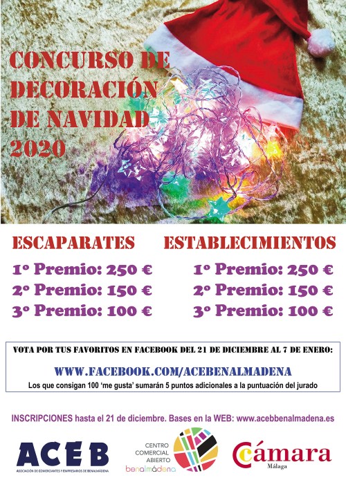La Asociación de Comerciantes y Empresarios de Benalmádena (ACEB) convoca el tradicional Concurso de Decoración de Navidad para establecimientos comerciales y empresas, con la colaboración de la Cámara de Comercio de Málaga. El certamen repartirá 1.000 euros en premios distribuidos en dos categorías. Para los escaparates, los premios serán de 250, 150 y 100 euros para el primer, segundo y tercer puesto, respectivamente, y otros tres para la categoría de establecimientos, también de 250, 150 y 100 euros para el primer, segundo y tercero clasificado, respectivamente.