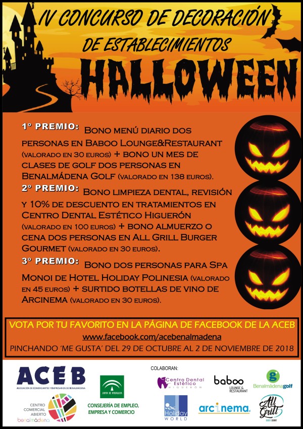 La Asociación de Comerciantes y Empresarios de Benalmádena convoca la cuarta edición del Concurso de Decoración de Establecimientos Halloween, que se organiza con la colaboración de Centro Dental Estético Higuerón, Hotel Holiday Polinesia, Baboo Lounge&Restaurant, Benalmádena Golf, All Grill Burger Gourmet y Arcinema, y la financiación de la Consejería de Empleo Empresa y Comercio de la Junta de Andalucía. Este certamen se organiza con el objeto de incentivar a los comerciantes y empresarios del municipio para que decoren sus escaparates y establecimientos durante las fechas próximas a la Festividad de Todos los Santos, con motivos alusivos a Halloween.