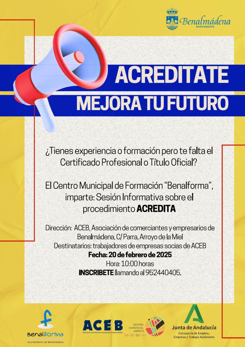 La sede de la Asociación de Comerciantes y Empresarios de Benalmádena (ACEB) y de la Asociación Centro Comercial Abierto de Benalmádena (ACCAB), acogerá el 20 de febrero, a las 10:00 horas, una sesión informativa sobre el procedimiento Acredita, ofrecida en colaboración con el Centro Municipal de Formación Benalforma.