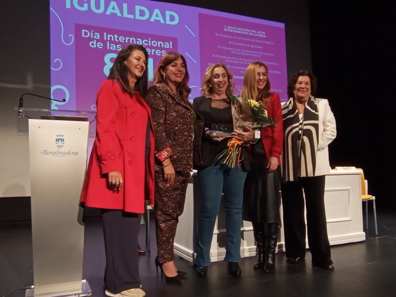 Dolores García Gómez, responsable del comercio Estación nº 5, y Cintia Manzano Rovira, al frente de Cultursol, han recibido el reconocimiento como empresaria veterana y empresaria emprendedora de la Asociación de Comerciantes y Empresarios de Benalmádena (ACEB) dentro del acto del Día Internacional de las Mujeres, celebrado hoy en la Casa de la Cultura de Arroyo de la Miel.