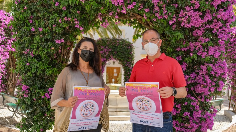 El mercado de economía circular y artesanía ‘Merkaderes de Benalmádena’ cambia su ubicación y horario, de forma que se celebra ahora en la entrada de la calle Real y plaza de Andalucía de Benalmádena Pueblo, de 19:00 a 24:00 horas. Esta iniciativa, que ha sido puesta en marcha por la Asociación de Comerciantes y Empresarios de Benalmádena (ACEB) con la colaboración del Ayuntamiento de Benalmádena, renueva su continuidad para adecuarse a la temporada estival. La presidenta de la ACEB, Rosa Mª González Rubia, y el concejal de Comercio, Javier Marín, han presentado el cambio del mercado en el lugar donde se desarrolla a partir de ahora, en la plaza de Andalucía, y han detallado que esta modificación se debe tanto a la llegada del buen clima nocturno como a la necesidad de dotar al mercado de un enclave más atractivo, y con ello incentivar las visitas y la propia actividad comercial del núcleo de Benalmádena Pueblo.