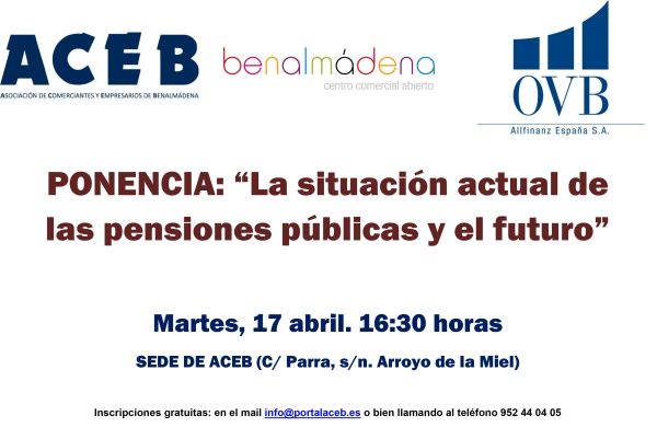 La ACEB acoge una ponencia sobre la situación de las pensiones públicas y el futuro, a cargo de OVB Allfinanz España. La sede de la Asociación de Comerciantes y Empresarios de Benalmádena (ACEB) acogerá el día 17 de abril a las 16:30 horas, una ponencia que abordará la situación actual de las pensiones públicas y el futuro, a cargo de la multinacional OVB Allfinanz España.