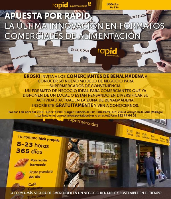 Eroski realizará en la sede de la ACEB una presentación para dar a conocer su nuevo modelo de negocio para supermercados de conveniencia, ideal para comerciantes que ya disponen de un local o están pensando en diversificar su actividad actual en la zona de Benalmádena. La presentación será el 1 de abril a las 17:00 horas.